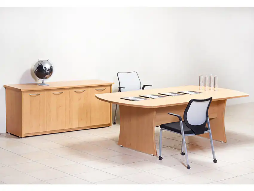 Con una solida base y estructura, esta mesa de juntas es muy agradable a la vista, pues su diseño combina perfectamente sus materiales con curvas y lineas rectas, disponible en varios acabados.