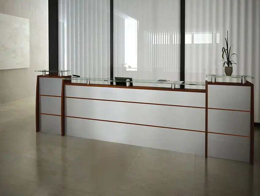 Lujosa e imponente recepción, con una estructura geométrica y remates curvos, disponible en gran variedad de acabados.