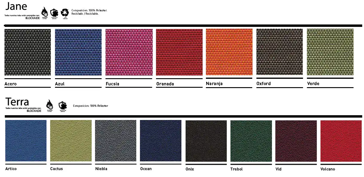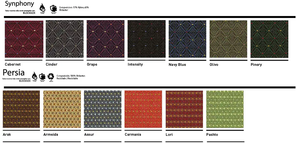Asiento y respaldo: Respaldo Fabricado en inyección de polipropileno de alta resistencia color Negro, Gris, Roja, Azul con superficie perforada para permitir la circulación del aire, mayor confort y diseño ergonómico. Asiento con acojinamiento de poliuretano de 41 kg/m3 de densidad con retardante de flama, parte inferior del asiento cubierto con tapa de polipropileno de alto impacto.